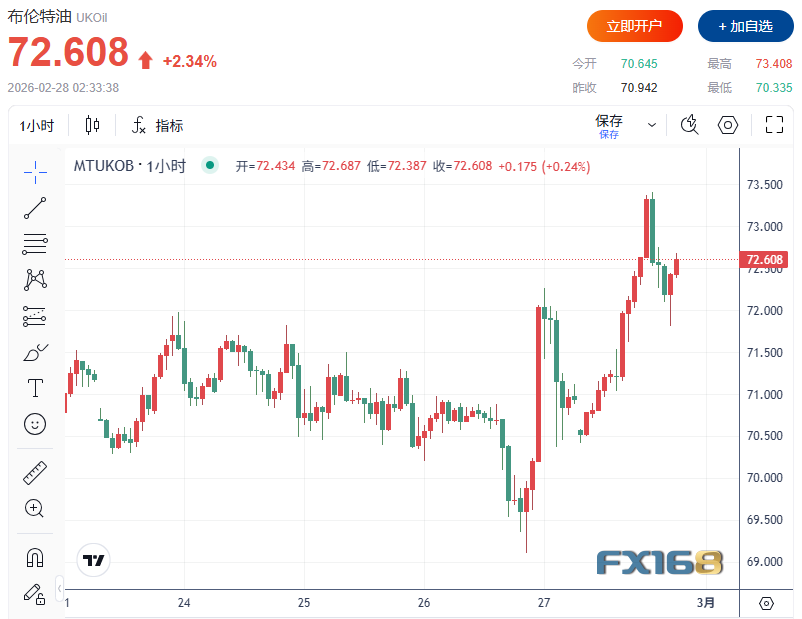 特朗普在白宫外对记者表示,对伊朗在核问题谈判中的态度感到不满。“我们对他们的谈判方式并不满意。他们不能拥有核武器。”此前他曾设定最后期限,要求伊朗在10至15天内达成协议,否则将面临“非常糟糕的后果”。 与此同时,阿曼外交大臣巴德尔·布赛迪计划前往华盛顿,与美国副总统万斯及其他官员会面,旨在“避免战争”。阿曼一直担任美伊间接谈判的斡旋方。美国国务院也宣布,国务卿鲁比奥将于下周一、周二访问以色列,讨论伊朗及其他地区议题。 美伊周四在日内瓦举行了间接会谈。会谈期间一度传出因美方坚持伊朗“零铀浓缩”而陷入僵局的消息,油价随即上涨逾1美元;但在阿曼方面表示“取得进展”后,涨幅有所收窄。双方计划下周在维也纳展开技术层级磋商。 受地缘政治风险溢价推动,国际油价周五大涨约3%。布伦特原油期货上涨至73.408美元/桶高点,WTI原油上涨至67.83美元/桶,均创下数月新高,并有望录得周线涨幅。