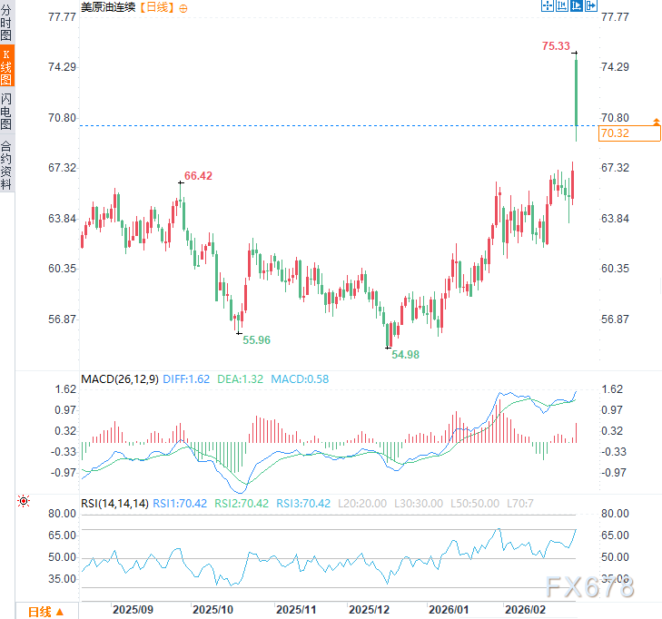 当前冲突已造成美军首例伤亡,并引发地区连锁反应。周一(3月2日)亚市时段,美原油价格跳涨超5%,此前一度触及近九个月高点75.33美元/桶,随后回落,现交投于每桶70.40美元附近,日内涨幅约5%。市场密切关注油价波动、地缘风险溢价以及全球能源供应链潜在中断影响。