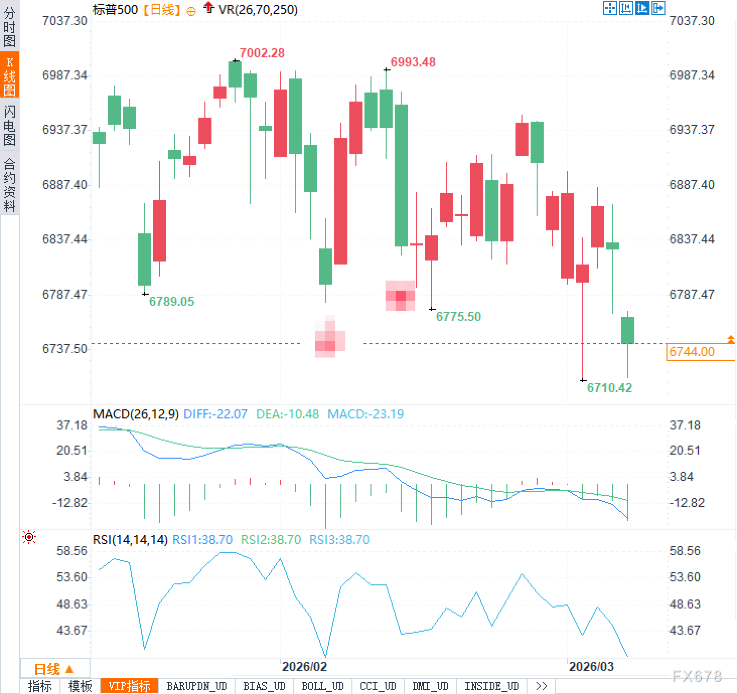 标普500指数近期走势呈现出明显的破位特征。从高点7002点回落以来,指数多次尝试反弹但均未能站稳关键阻力。进入3月后,伴随油价加速上行,卖压逐步累积,最终导致指数有效跌破6780点区域。这一破位不仅打开了向更低位6530点回测的空间,还强化了短期下行趋势的确认。K线形态显示,近期连续出现阴线,反映多头力量逐步衰竭,下方抛售压力持续释放。近期低点已探至6710点附近,短期支撑面临严峻考验。