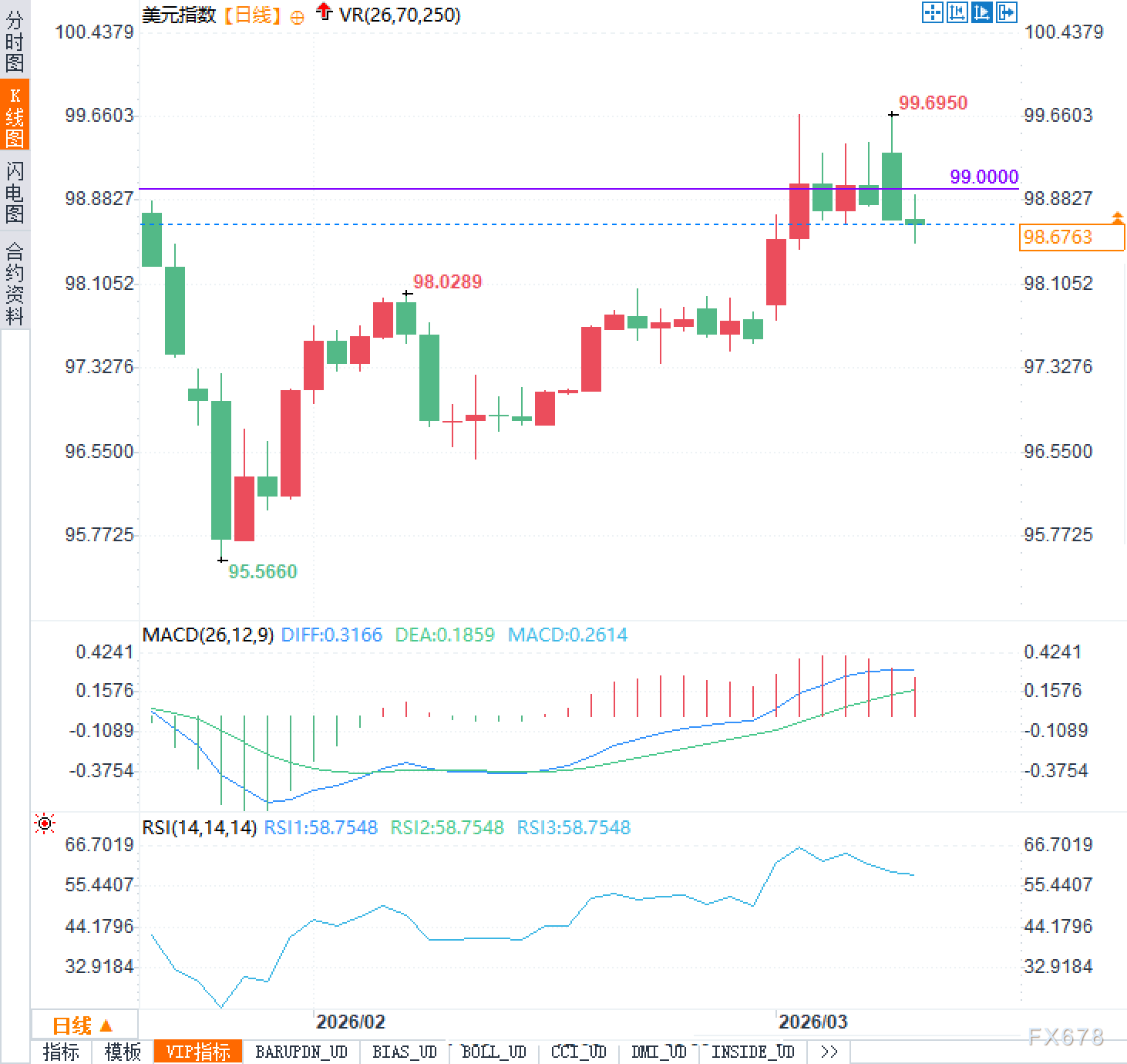 日线图显示,美元指数从99.6950高点回落,正测试98.0000心理关口。MACD指标中DIFF值为0.3166、DEA为0.1859、MACD柱为0.2614,仍维持金叉但柱线收窄,表明上行动能逐渐衰减;RSI(14)读数在58.7,处于中性偏多区间,未进入超买区。若有效失守98.50,将打开下行空间直指区间下沿98附近;反之,站稳99则可能重启反弹。