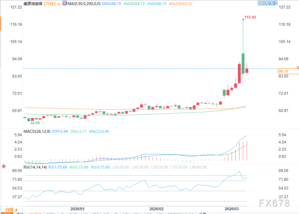 本轮上涨始于2025年12月16日的54.87美元低点,最高触及119.48美元(2022年3月以来新高),累计涨幅超过118%。当前油价正在测试50%-61.8%斐波那契回调区间:87.18-79.55美元。这一区间正是多空决战的关键——最新交易数据显示,若守住87.18美元,买盘将快速回归;若放量跌破79.55美元,则可能加速下探趋势线支撑67.68美元。