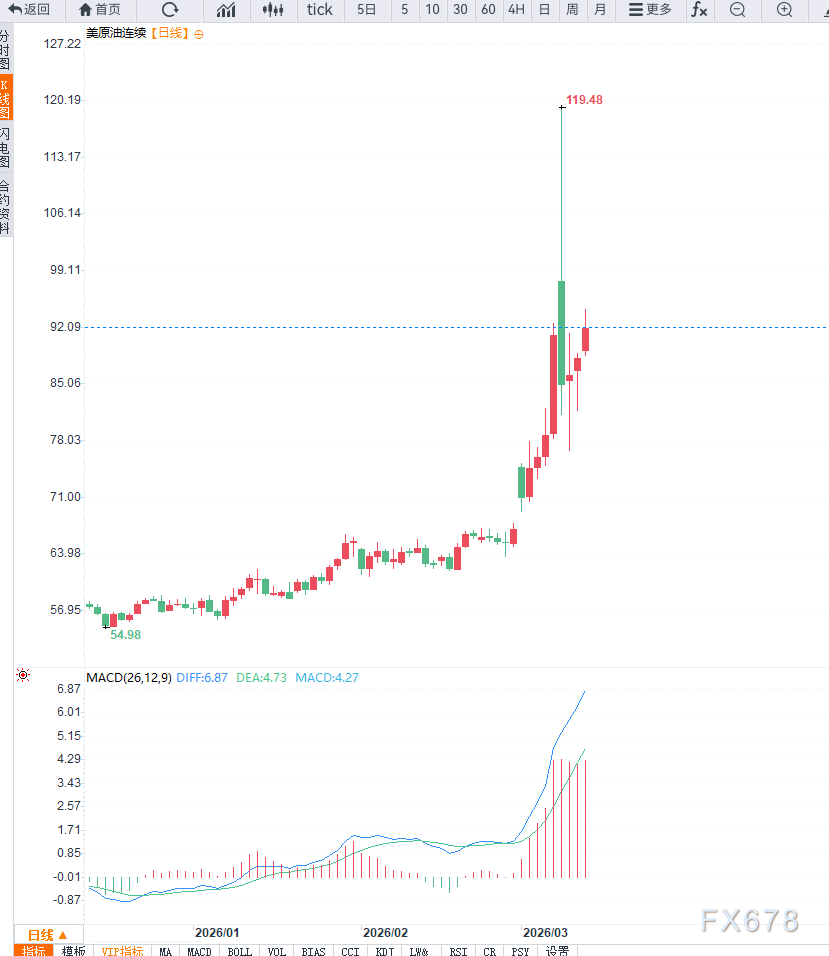 在技术面方面,从日线结构来看,WTI原油价格近期已经重新回到上升通道内部,价格突破90美元关键心理关口后,市场多头动能明显增强。当前主要阻力位位于95美元附近,如果地缘风险持续发酵,油价存在进一步测试98美元至100美元区间的可能性。下方关键支撑位则位于88美元和85美元附近,这两个位置此前形成明显成交密集区,一旦价格回落至该区域,可能吸引部分买盘入场。