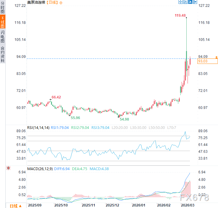 周四(3月12日)亚市时段,美原油价格震荡上涨,现交投于每桶93.40美元附近,日内涨幅约7%,霍尔木兹海峡中断带来的供应冲击持续刺激油价。