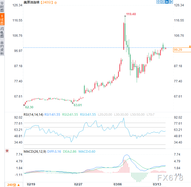 周一(3月16日)亚欧时段,美原油价格冲高后震荡回落,现交投于每桶99.30美元附近,日内涨幅约0.6%。