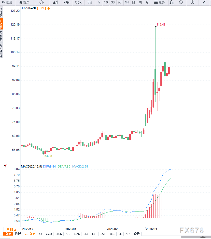 从技术面来看,原油日线结构已经突破前期震荡区间上沿,呈现明显的上升趋势延续特征,下方关键支撑位上移至90美元附近,而上方阻力关注100美元及110美元区间,动能指标显示多头占据主导地位。从4小时周期观察,油价形成阶梯式上行结构,多次回踩后迅速反弹,短期均线系统呈多头排列,若突破100美元整数关口,则可能进一步打开上行空间,若反复测试100美元未果,则不排除短期继续调整的可能性。