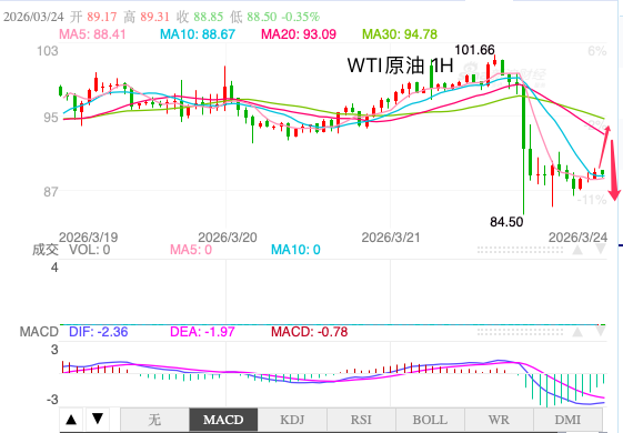 4小时级别上,油价呈现典型的“瀑布式下跌”结构,短期均线系统出现死叉,价格运行在均线下方,显示空头主导节奏。当前反弹更多属于技术性修复,上方关注95美元的压力情况,若无法有效突破,行情仍可能延续震荡偏弱走势。同时,MACD指标在零轴下方扩大,进一步强化短期下行风险。