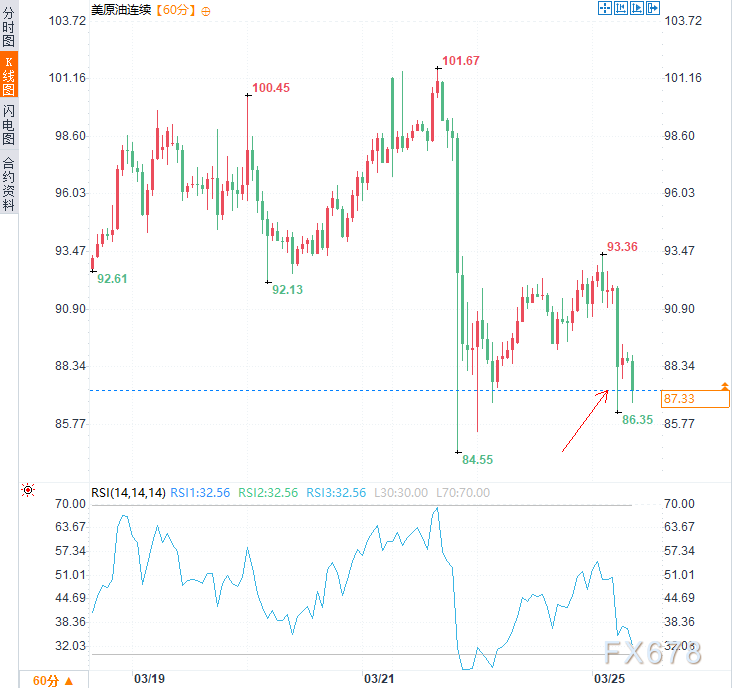 周三亚市早盘时段,美原油价格震荡下行,延续了隔夜的回落走势,现交投于每桶87.50美元附近,日内跌幅约5.2%,早些时候一度下跌6.22%至86.76美元/桶。
