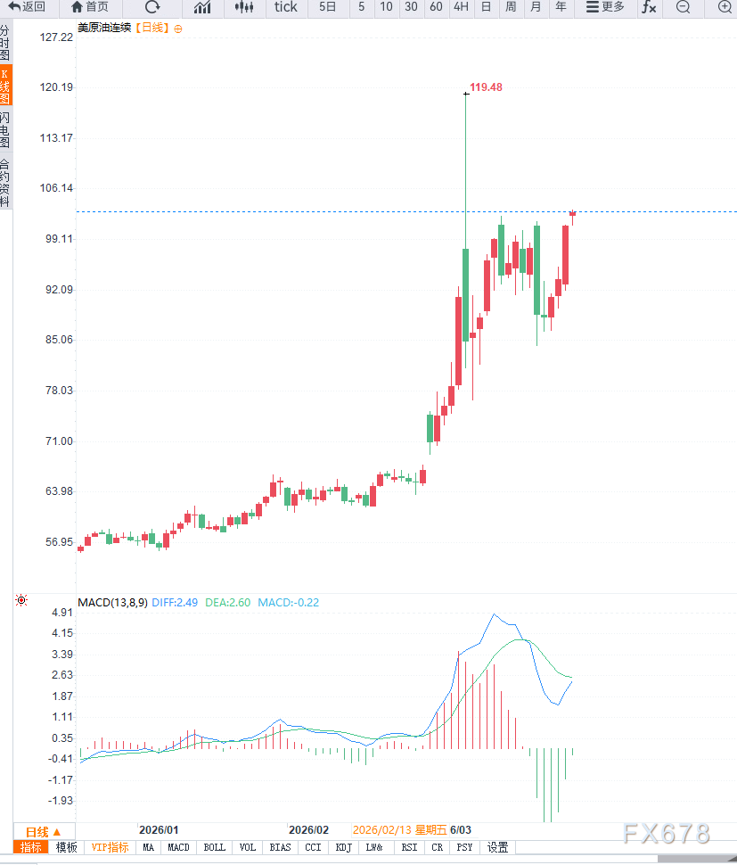 从市场反应来看,资金持续流入原油市场以对冲潜在供应中断风险。WTI价格一度触及100美元上方,并逼近此前三年高点113.28美元区域。尽管涨势延续,但价格运行节奏出现变化,相较此前的快速拉升,当前上涨更多表现为“中枢上移后的震荡上行”,显示市场在高位逐步消化利多因素。