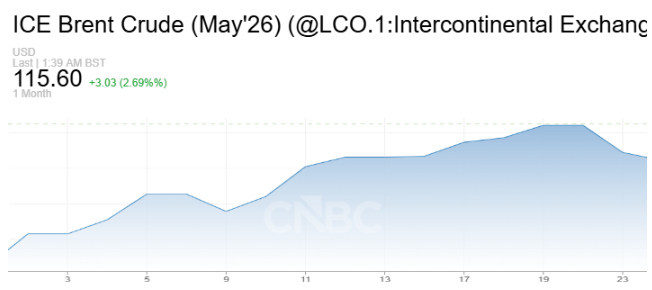 美股期货方面,市场情绪同样偏弱。道琼斯工业平均指数期货下跌253点,跌幅约0.6%;标普500指数期货与纳斯达克100指数期货均回落约0.5%。此前上周五,美国三大股指已显著下挫,道指大跌793.47点,跌入技术性回调区间;标普500指数下跌1.67%,收于七个月低位;纳斯达克综合指数下跌2.15%。从周线表现看,标普500指数已连续第五周下跌,科技股为主的纳指当周累计跌幅达到3.2%,显示全球风险资产已在高油价与战争风险的双重夹击下持续承压。 数据显示,国际基准布伦特原油5月期货在亚洲早盘一度上涨2.92%,报115.86美元/桶;美国西德州中质原油(WTI)期货上涨3.20%,报102.80美元/桶。