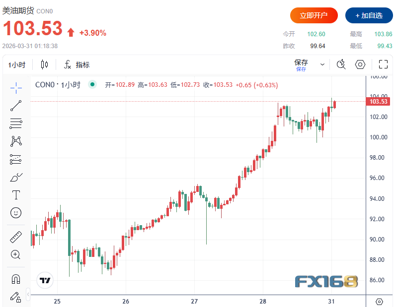 从技术面来看,日线级别上,布伦特原油整体处于强势上行趋势中,但在快速拉升后动能开始分化,价格波动加剧。上方关注112美元及125美元关键压力区间,下方支撑位位于100美元及95美元区域。4小时级别来看,价格呈现高位震荡结构,短期动能指标出现超买回落迹象,显示市场存在技术性修正需求。若回落至关键支撑区域并企稳,仍可能再度上行。