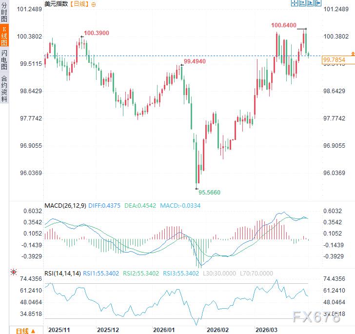 周三亚市时段,美元指数于99.80附近窄幅震荡,此前一个交易日美元指数显著回调,日内跌幅0.61%。