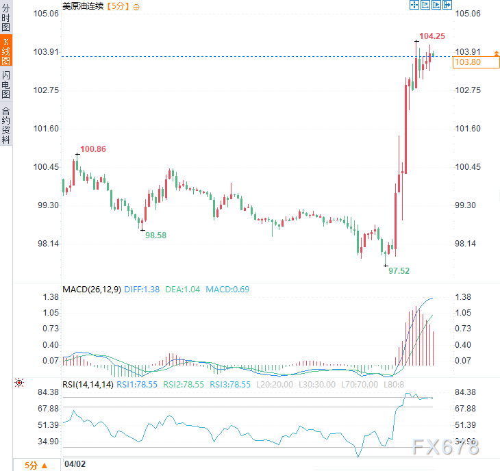 讲话期间,美原油价格快速拉升近6美元,现交投于每桶104美元附近,日内涨幅约4%,扭转早盘逾2%的跌幅%。