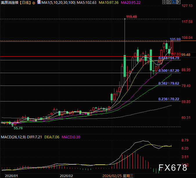 技术面如之前文章所说,只要油价守住97,依然是健康多头形态,油价果然守住后暴涨,目前关键位在105.89,斐波那契的0.786分位,支撑在5日线的102.5附近。