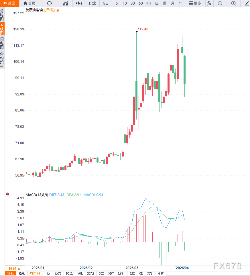 汇通财经APP讯——国际原油市场在周三亚盘时段出现剧烈波动,WTI原油价格自盘中高点大幅下挫,从108美元上方快速跌破100美元关口,创下本轮冲突以来最大单日跌幅。此次价格剧烈调整的核心导火索在于美国总统特朗普宣布暂停对伊朗的军事行动,为期两周,这一决定显著缓解了此前市场高度紧张的地缘风险情绪。