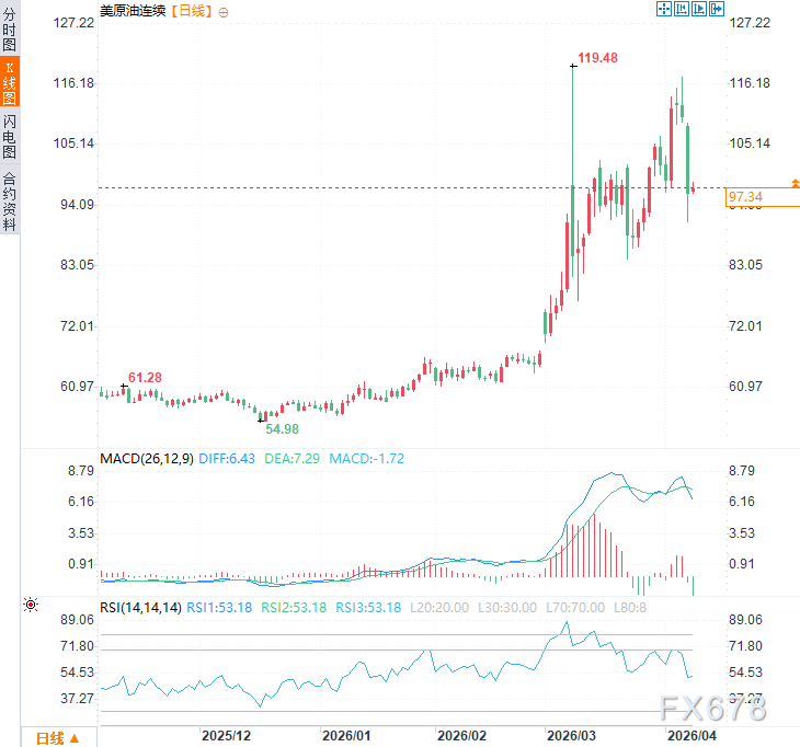 因两周停火协调后仍存核心分歧,美原油价格在周三触及91美元/桶附近后,回升超2.5%,周四亚欧时段延续震荡上行,现交投于每桶97.50美元附近,日内涨幅约3.2%。