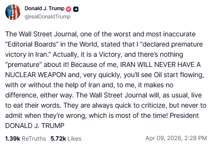 这一警告进一步加剧了美国与伊朗之间本就脆弱的停火局势。就在不到两天前,双方才刚刚开始执行停火安排。 特朗普在周二晚间曾表示,美国愿意暂停针对伊朗的敌对行动两周,条件是伊朗必须同意“全面、立即且安全地开放霍尔木兹海峡”。 不过,作为全球约20%石油供应运输要道的霍尔木兹海峡,其船舶通行量目前仍受到严格限制,自2月28日冲突爆发以来,这一局面并未明显缓解。 据英国《金融时报》周三报道,伊朗正计划向航运公司收取通行费用,并要求以加密货币支付,作为允许船只通过该海峡的条件。 特朗普随后还在另一则帖文中表示:“因为有我,伊朗永远不会拥有核武器。而且很快,你们就会看到石油重新流动起来,无论伊朗是否提供帮助,对我来说都没有区别。” 除了向伊朗施压外,特朗普还将矛头指向《华尔街日报》编辑委员会。此前该报评论称,特朗普过早宣布对伊朗“取得胜利”。对此,特朗普反驳称:“这本来就是一场胜利,而且根本谈不上‘为时过早’。”