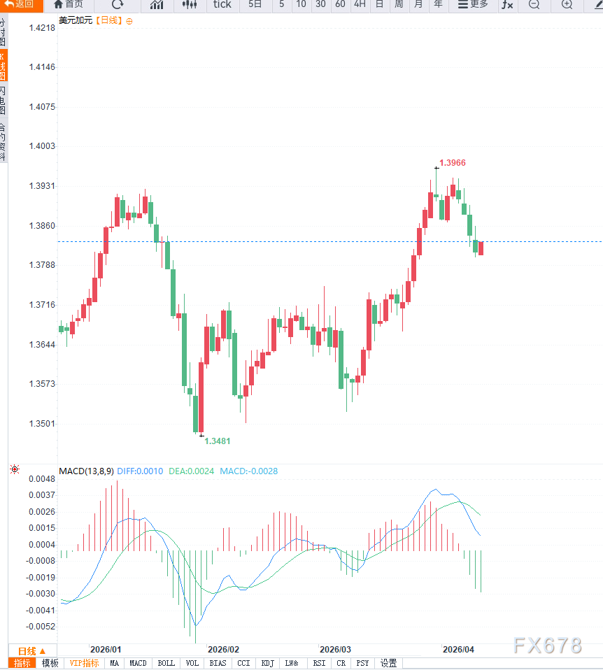 从基本面来看,加元作为典型的商品货币,与原油价格走势高度相关。近期国际油价大幅波动,在美国与伊朗达成短期停火协议后,市场对供应中断的担忧有所缓解,导致油价出现明显回落。WTI原油本周累计跌幅超过11.5%,对加元形成直接压力,使USD/CAD获得上行动力。