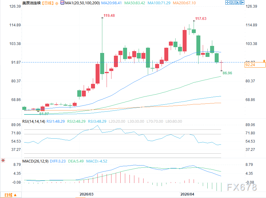 部分技术分析师认为,目前的WTI技术面显示双顶形态:当前高点(3月119.50美元与潜在4月反弹高点)若无法突破120美元,或构成经典双顶,暗示战争“得到处理”后价格将回落至战前水平。这一观点认为若停火延长,双顶将确认熊市反转。