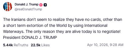 尽管如此,标普500指数本周累计上涨约3.6%,纳斯达克上涨约4.7%,道指则上涨约3%。三大指数均录得自去年11月以来的最佳单周表现。美国总统特朗普周五在Truth Social上指责伊朗“利用国际水道对全世界进行短期勒索”,并称伊朗领导人“似乎没有意识到他们并没有任何筹码”,还表示“他们今天之所以还能活着,唯一原因就是为了谈判!”#伊朗危机追踪#