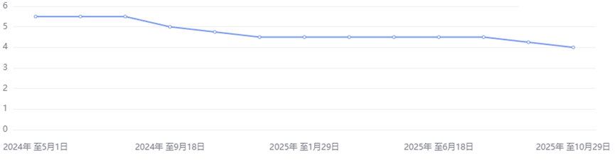 美国至10月29日美联储利率决定位4%,符合市场预期,前值位4.25%。