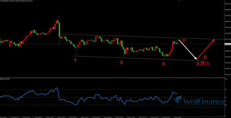 周二(12月9日)欧盘时段,金价探底反弹,市场走向震荡向上,但是目前行情始终处于通道震荡阶段,也不可以大幅度看涨,日内黄金价格二次下探了一周低点附近,之后受到美元指数带动反弹们目前在4200美元关口附近整理,一方面,美联储降息预期持续发酵,另一方面,周一基准10年期美国国债收益率攀升至2个半月高点,原因是市场猜测美联储主席杰罗姆·鲍威尔在会后新闻发布会上可能释放“进一步降息门槛提高”的鹰派信号,这一因素持续对黄金构成压制。现货黄金日线图显示金价盘中跌破了上升通道下轨,并且跌破5日线、10日线,走势并不乐观,目前可以被视为跌破后的反弹,金价需要收盘收在5日线以及下轨之上才有利于多头继续进攻。但如果金价近期持续在4200附近震荡,同时不出现明显下跌,则配合消息需要防止金价出现快速向上的行情。