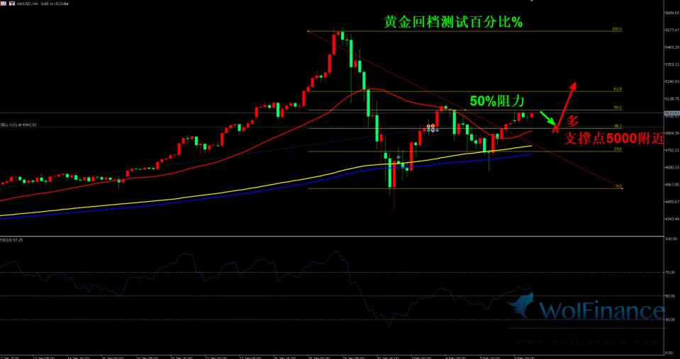周一(2月9日)美盘时段,现货黄金开盘小幅上涨后全天维持整理态势,守住上周五的全部涨幅,上周五黄金涨收涨3.88%。当前现货黄金市场深陷多空力量博弈的平衡格局,基本面的支撑与压制相互对冲,而资金面加快去杠杆的动作,进一步削弱了黄金多头的上攻动能。目前现货黄金在5000美元整数关口上方维持横盘整理,市场交易端整体持观望态度,静待核心经济数据给出明确走势指引。整体来看,当前现货黄金处于基本面支撑与压制相互对冲的格局,而资金面去杠杆引发的头寸收缩,进一步放大了多空博弈的平衡状态,短期金价大概率将继续在5000美元关口附近维持横盘整理。