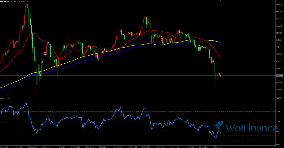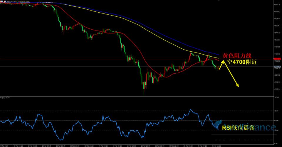 周五(03 月 20 日)美盘前(欧盘时段),现货黄金短线低位震荡,当前报价4662.32美元 / 盎司,日内交投于4600-4702.38美元 / 盎司区间,空头趋势持续主导。基本面:美联储 3 月利率决议已落地,维持3.50%—3.75%基准利率不变,点阵图大幅下调年内降息预期,释放明确鹰派信号,鲍威尔讲话强调通胀未达标不降息,高利率周期进一步拉长,直接推升美元指数与美债收益率走高,持续压制无息黄金的持有价值,资金持续从贵金属市场流出,成为金价下行的核心驱动力。除此之外,结合市场其他主流观点来看,原油高位运行虽小幅抬升通胀预期,但现阶段市场核心交易逻辑为货币政策收紧,避险与通胀支撑逻辑暂时失效;全球黄金 ETF 持仓出现阶段性减持,投机资金空头持仓占比攀升,进一步加剧盘面弱势,仅有中东地缘局势紧张为金价提供微弱底部支撑,难以扭转整体空头格局,整体呈现决议利空持续消化、短线超跌酝酿小幅反弹,反弹后依旧延续空头的走势格局。