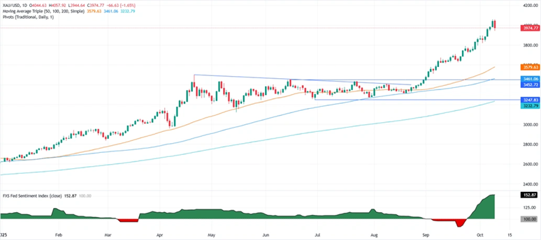 周四(10月9日),美市时段,黄金与白银价格显著下跌,主要因短线期货交易者的获利了结(profit taking)与多头平仓(long liquidation)所致。此前金价在周三创下历史新高,银价亦在今日触及14年来最高点,市场短期调整压力骤增。分析人士指出,在近期涨势强劲后,周末前(周五)或将出现更大幅度的获利回吐。