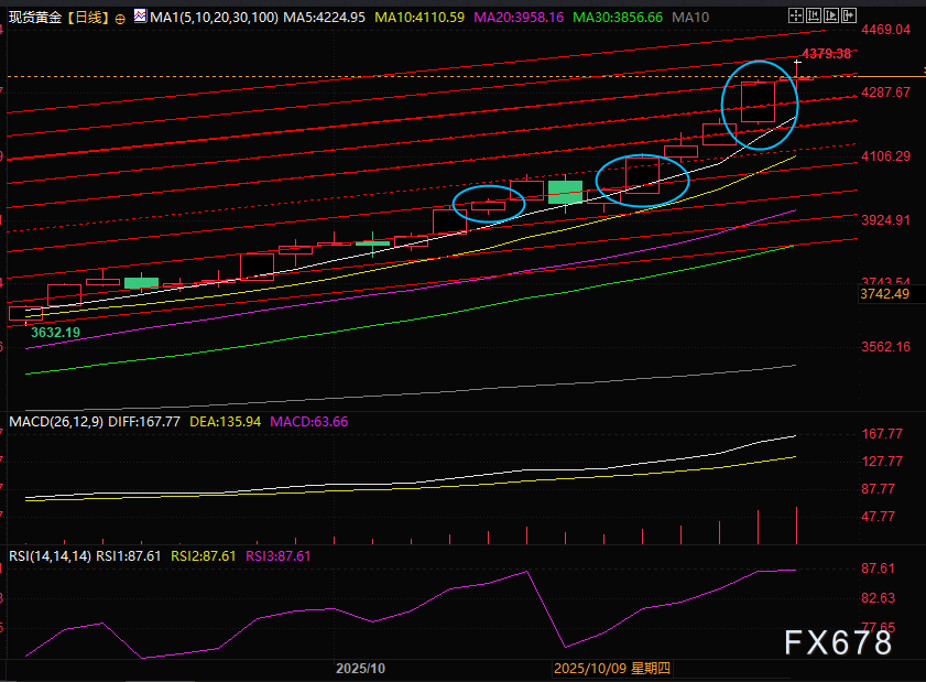 现货黄金日线图显示,现货黄金这波上涨一直在加速,蓝圈显示现货黄金从三天两通道,三天三通道到这波的三天四通道,金价从3天涨120美金到三天涨200美金到这次的三天涨230美金。