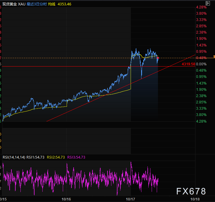 汇通财经APP讯——周五(10月17日),亚欧时段,现货黄金走出探底回升V型反转的走势,盘中一波下跌2%,约100美金,之后快速收复失地,目前交投于4333附近,上个交易日的周四黄金则加速上涨了130个点涨幅2.8%。