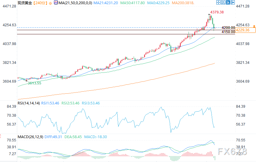 在4小时图上,即时支撑位在21期简单移动平均线附近的4230美元,其次是50期简单移动平均线附近的4115美元。相对强弱指数(RSI)已回落至53左右,从超买区域回落,这可能使价格在下一步上涨之前进行盘整。