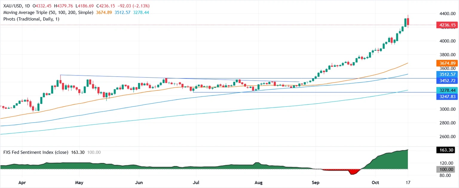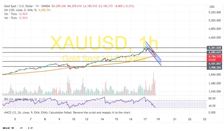 知名财经网站FXDailyReport分析师Nicholas Kitonyi指出,周五,金价从约4380美元/盎司的历史高位暴跌。从技术面来看,根据60分钟走势图,黄金价格处于一个下行通道内。14小时相对强弱指数也支持短期看跌偏见,因其接近超卖状态。