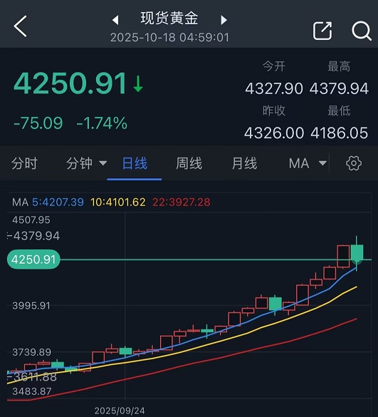 现货黄金周五收盘暴跌75.09美元,跌幅1.74%,报4250.91美元/盎司;金价盘初曾触及历史高点4379.94美元/盎司。
