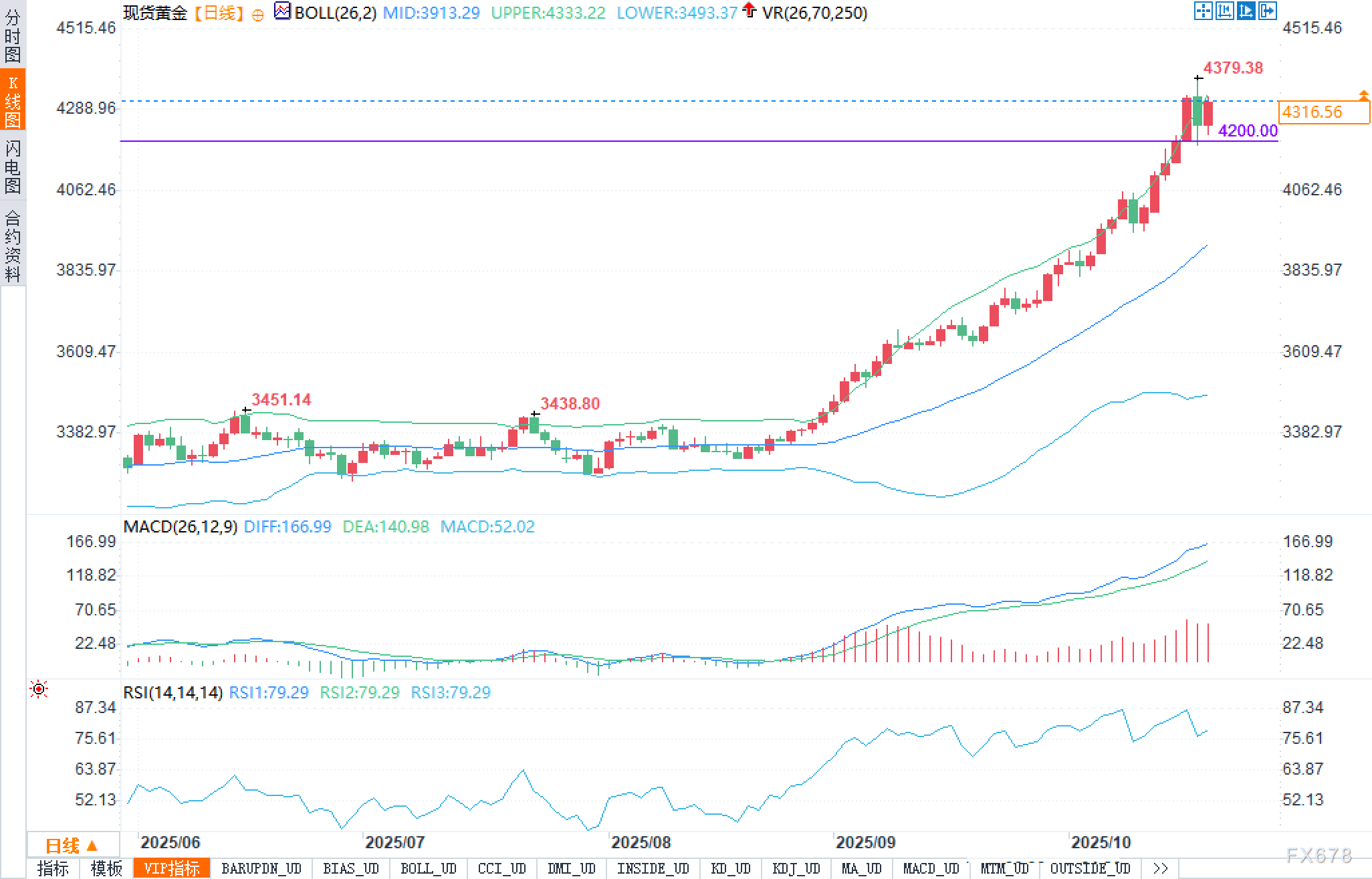延续上攻(偏多):若价格企稳4300之上,并伴随日内阳线实体扩大、收盘靠近或站上 4333.22,则上轨“行走”结构得以延续,目标将重新指向4379.38。此路径要求:RSI保持高位钝化、MACD红柱不明显缩短或再度放大,否则冲高后仍有反复。