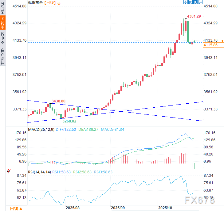 现货黄金价格本周二(10月21日)遭遇重挫,单日跌幅高达5.3%,黄金市场在经历五年来最剧烈的单日回调后,正显现初步复苏迹象。周三现货黄金与12月COMEX期货合约的日线图上均形成十字星形态,暗示本轮剧烈波动后可能迎来趋势拐点。周五现货黄金微幅走低,跌幅约0.22%,交投于4116.21美元/盎司附近。
