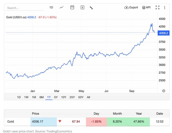 周一(10月27日)亚市盘中,金价约为4,060美元/盎司附近。尽管金价自上周以来出现猛烈回调,但今年迄今仍上涨近48%,有望创下自20世纪70年代末以来的最高年度表现。