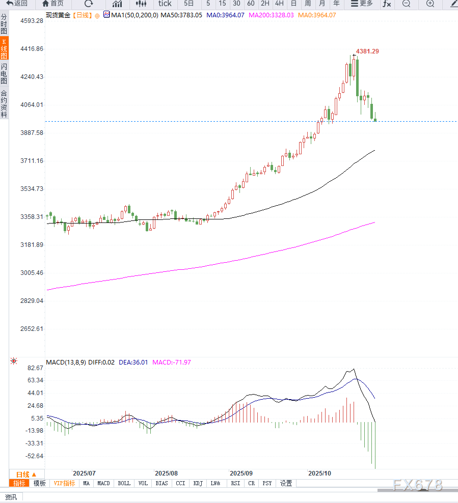 技术面上,金价短线已跌破4000美元心理关口,空头动能逐步增强。
