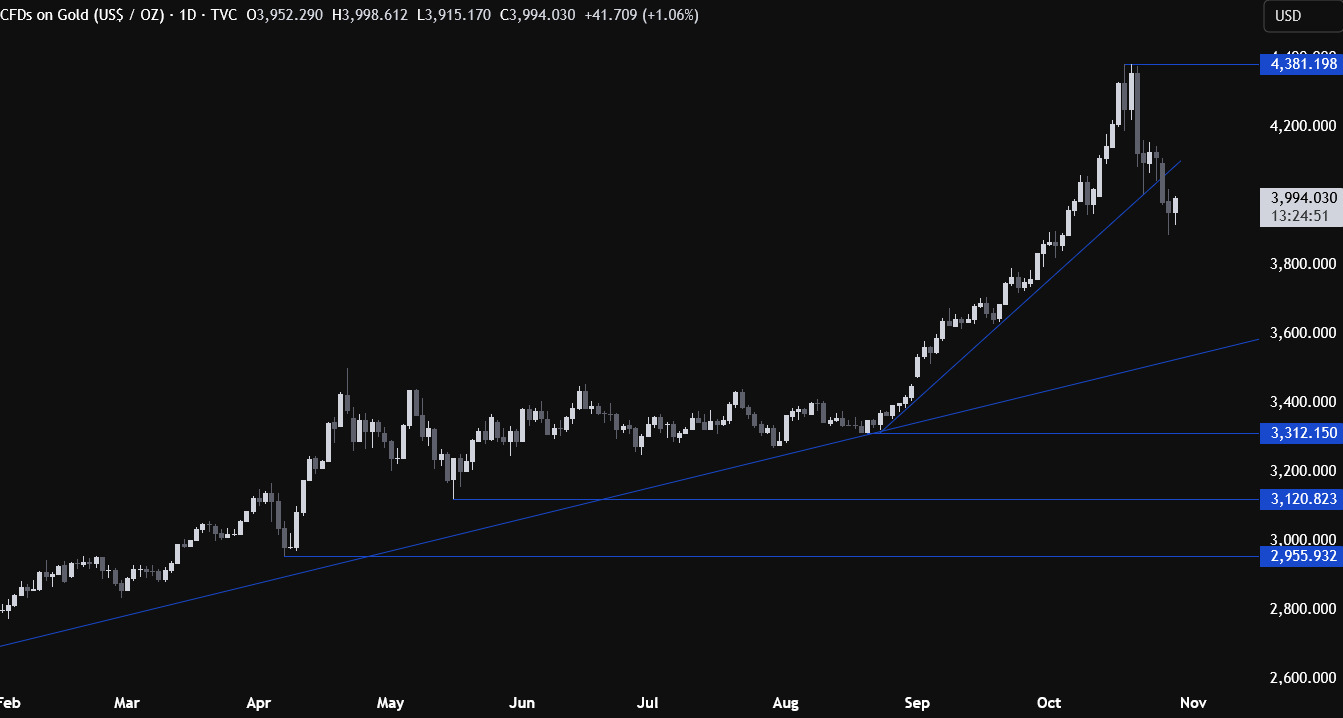 若趋势线被下破,空头将重新占据主导,可能推动金价下探 3,819美元。图中红线为当日平均波动区间。