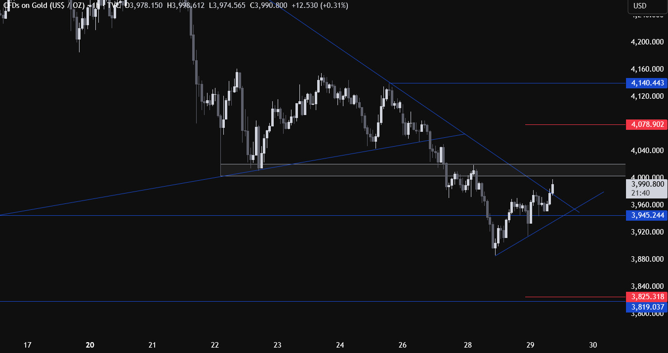 在1小时图上,金价面临 4,000–4,020美元区间 的轻微阻力。若价格在此受阻,空头可能在该区间上方设置止损,尝试做空,目标为新的低点。若突破该阻力区,多头则会增持头寸,目标上看 4,138美元。同时,可以看到短期的 上升趋势线 正在定义当前回调走势。若价格回踩至趋势线附近,多头可能再次入场,并将止损设在趋势线下方,力图推动价格创新高;