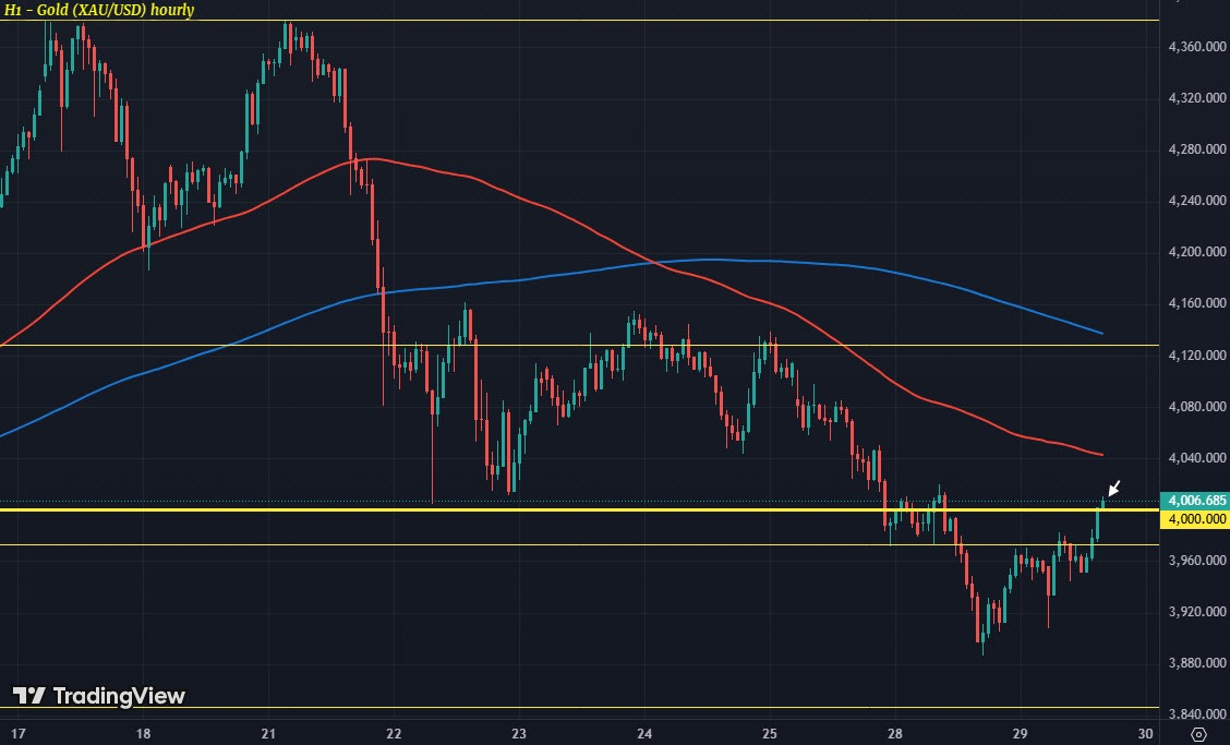 在现货黄金的1小时图上,100小时移动均线(红线) 目前位于 4,042美元附近,是短线的关键关注点。若金价持续低于该水平,短线趋势仍偏空;但若买盘能推动金价重新站上这一位置,便可能再次发起反攻,寻求巩固自上周下跌以来的反弹。
