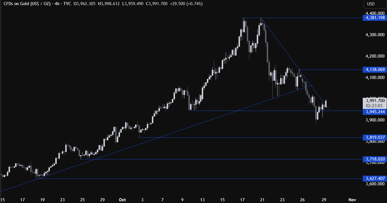 在4小时图上,黄金正在 突破一条短期下降趋势线,这可能预示着短线动能正在转向,并打开反弹至 4,138美元 的空间。多头可能在当前区间逐步加仓,并将止损设在 3,945美元下方,以布局向4,138反弹的行情。相反,空头希望价格能重新跌回趋势线下方并失守4,138,这将构成“假突破”,从而强化空头动能,目标指向 3,819美元。
