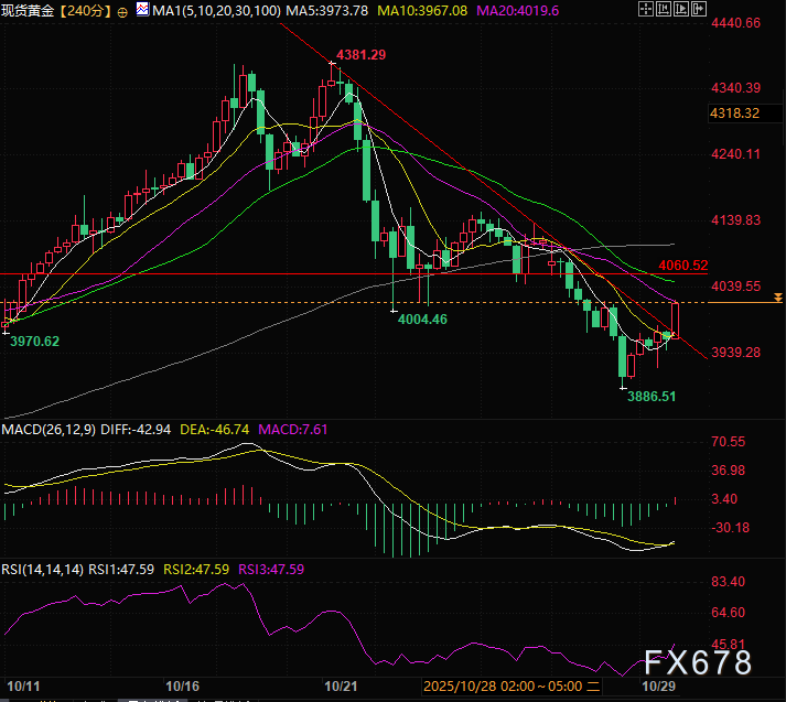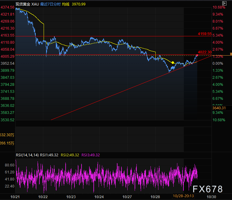 汇通财经APP讯——周三(10月29日)亚欧时段现货黄金小幅探底后展开反弹攀升至4000美元心理关口,目前涨1.83%,交投于4025.34附近。此前连续三日的下跌走势暂告终结——前一交易日金价曾触及逾三周低点。市场对美联储今日晚些时候下调借贷成本、且12月再度降息的预期持续升温,推动资金流向无息资产黄金。