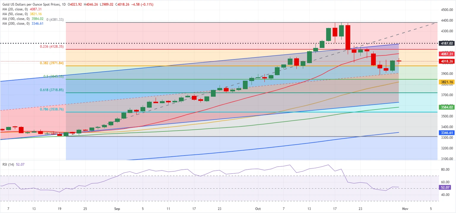 支撑位: 3970美元(38.2%回撤位)、3900美元(通道中枢)以及3850–3820美元(50%回撤与50日均线)。