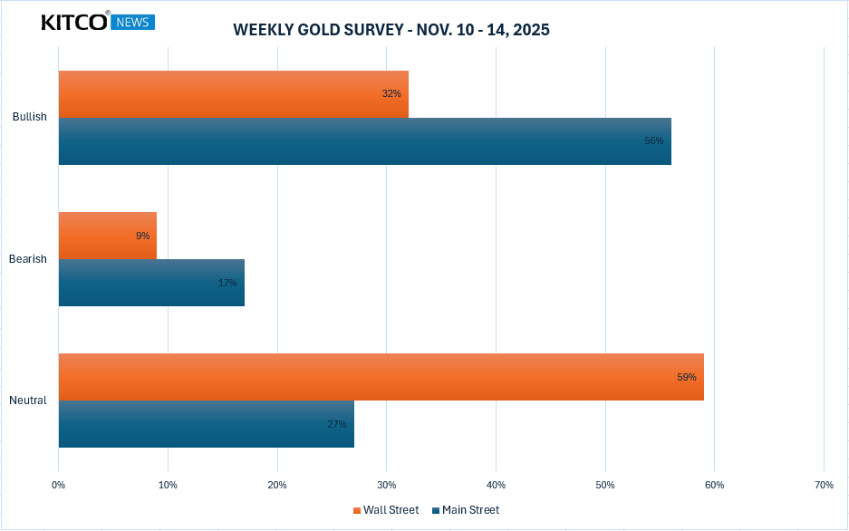 华尔街谨慎观望,散户信心不减根据Kitco News的最新黄金调查:共有21位华尔街分析师参与,其中 59%(13人) 对下周金价持中性观点,32%(7人) 看涨,9%(2人) 看跌。