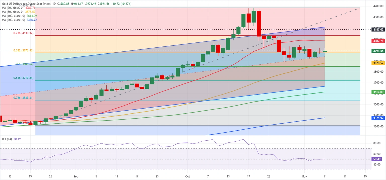 上行方向,阻力位依次位于4080美元(20日均线),4130美元(8–10月涨势的23.6%斐波那契回撤位)以及4200–4215美元区间(心理关口与上升通道上轨)。