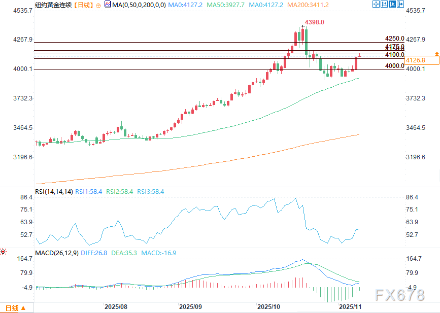 汇通财经APP讯——周二(11月11日)美国早盘交易中,黄金和白银价格走高并触及三周高点,延续了周一的强劲涨势。美国政府有望很快重启的预期本周初提振了贵金属市场,因为美国经济数据的恢复发布可能为美联储在12月降息铺平道路。12月交割的黄金期货盘中上涨4.1美元,报4126.00美元/盎司;12月交割的白银期货盘中上涨0.329美元,报50.640美元/盎司。
