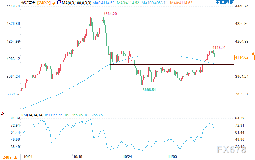 汇通财经APP讯——周二(11月11日)美盘时段,现货黄金在4150美元附近遭遇卖盘,回吐早盘涨幅,未能延续周一的大幅上涨态势。金价盘中交投于4113美元左右,在欧洲时段早盘触及三周高点后回落。