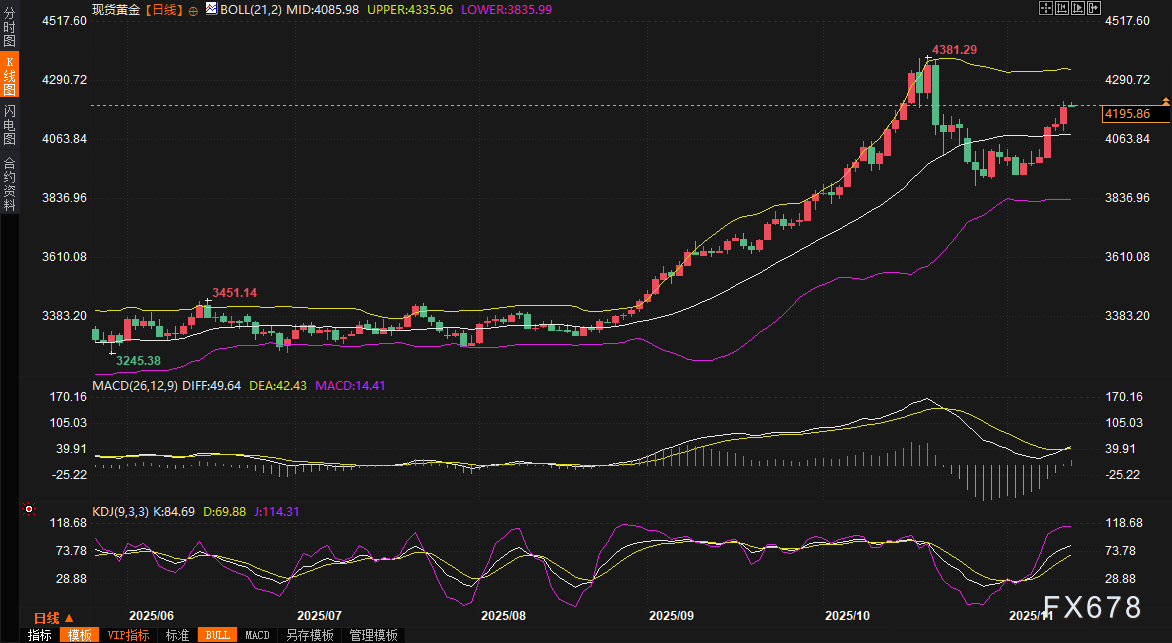 汇通财经APP讯——在沉寂数周后,黄金市场再度成为全球投资者的焦点。周三(11月12日)金价单日暴涨近2%,强势突破每盎司4160美元关键位置,盘中一度触及4211美元高点,创下自10月21日以来的最高水平。这场突如其来的大涨并非偶然,而是多重因素共同作用下的必然结果。周四(11月13日)亚市早盘,金价高位窄幅震荡,目前交投于4190美元/盎司附近。