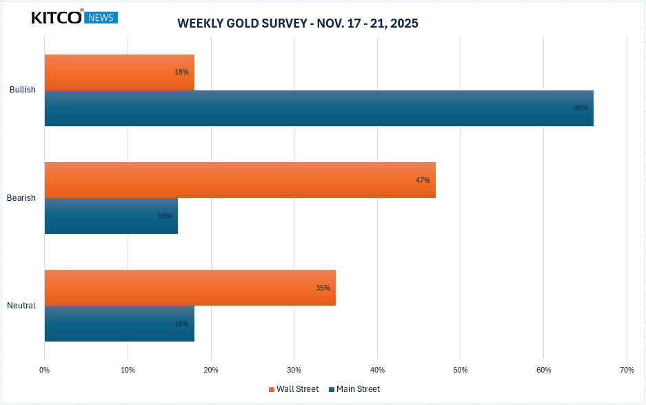 Kitco黄金调查:散户坚定看涨 华尔街分歧明显本周,共有 17 位华尔街专业分析师参与 Kitco 调查,其中:47%(8人)看空黄金,35%(6人)中性,18%(3人)看涨。