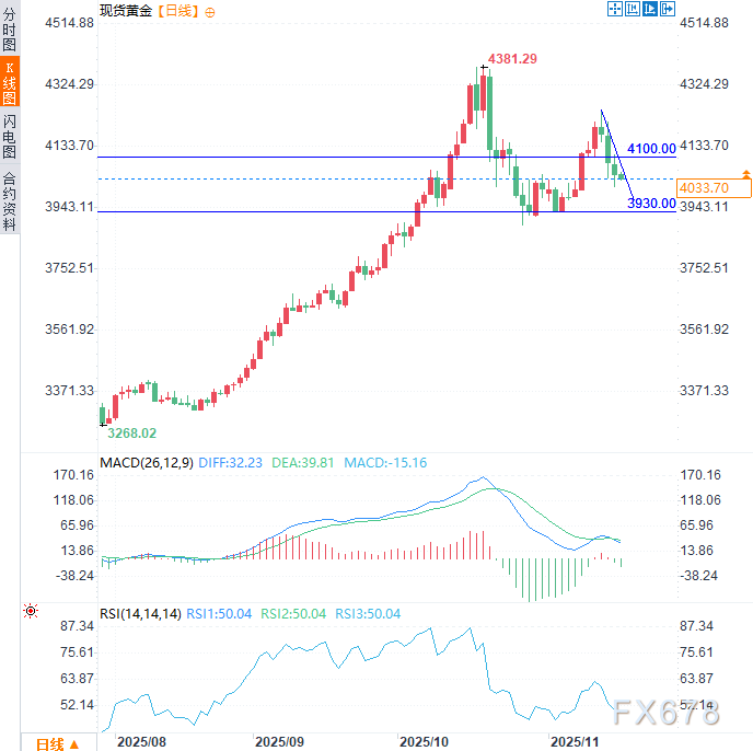 从技术面看,黄金图表在上周末段的看跌走势后已略显偏空。金价在4000-4050美元区域出现的剧烈反应,凸显了该区域的重要性——此处正是前段时间金价的震荡整理区间,这印证了关于金价可能形成阶段性顶部的判断。